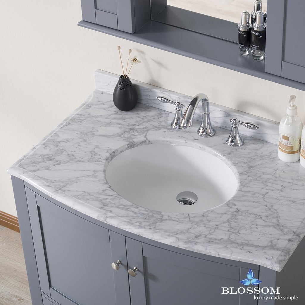 The Rome series offers beauty and elegance by bringing modern engineering to accommodate traditional or modern charismas. Our vanities are engineered to prevent warping by using environmentally friendly and zero emissions strong Solid Wood material, depicting sophistication for your home and providing long lasting durability. Combined with a sturdy White Carrara Marble countertop, backsplash, ceramic sink and matching Solid Wood framed mirror; this set offers a functional and gorgeously alluring look. This series is available in many different sizes to fit each home's appropriate spacing needs.